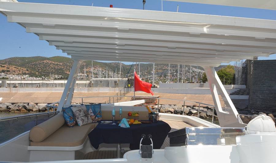 Güneşlenme minderleri, Flybridgede yemek masası, Salonda yemek masası, Salonda müzik sistemi.